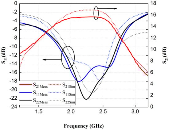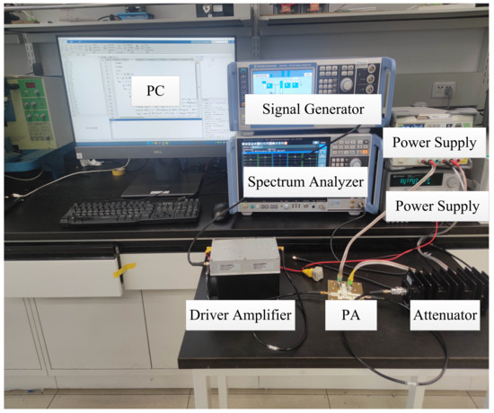 As shown in Figure 12, the measurement setup includes a signal generator (SMW200A), a spectrum analyzer (FSW-43), two power supplies (E3632A, DP832A), a driver amplifier (ZHL-16W-43-S+PA), a DUT, an attenuator, and a PC. The layout design of the PA is shown in Figure 13, and the circuit size is 8.8 cm × 8.6 cm. A Rogers 4350B with a thickness of 20 mils and a dielectric constant of 3.66 was used as the substrate. As shown in Figure 14, S-parameters were measured at 2.05–2.65 GHz using an Agilent N5230C vector network analyzer.
