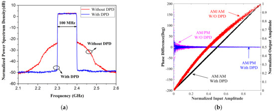 Linearity with and without DPD correction of the designed PA. (a) Measured PSD (power spectrum density). (b) Measured AM/AM and AM/PM.