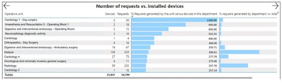 The “Number of requests over number of devices per hospital wards” (Appendix B) index assesses the ratio of maintenance requests opened by each department to the number of devices installed in them. ASST GOM Niguarda calculates this annually, using data from ControlASSET®, expressed as a percentage. The index aids in identifying departments with high maintenance request rates relative to installed devices. Figure 7 displays the dashboard, offering a comprehensive view of departmental data. Detailed analyses help pinpoint causes, especially concerning equipment obsolescence. This index is crucial for promptly addressing maintenance needs and optimizing equipment management.