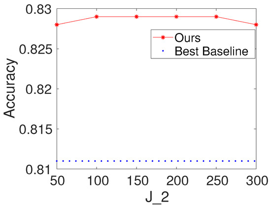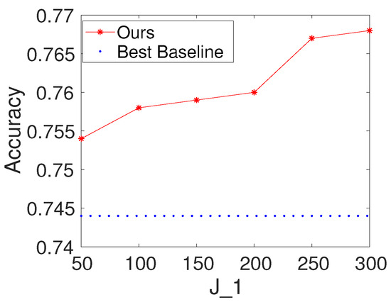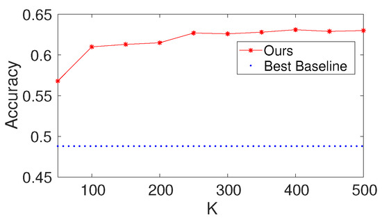 To investigate the effects of the number of hidden nodes in the fully connected layer, we first select K and to be 100. We then vary the values of as . We report the results of the proposed method with different values of for Seismic and Protein. For comparison, we also present the result of the best baseline. The results are shown in Figure 5 and Figure 6. Based on the figures, we make the following observations: (i) the performance of the proposed method is fairly good when is from 50 to 300; (ii) from the point of view of trade-offs between training cost and performance, it seems like a reasonable point when setting to be 100.