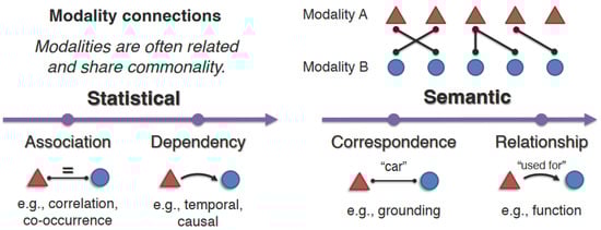 Figure 1. Modality connections [3]. - Modality interactions: Modality interactions study how modality elements interact to give rise to new information when integrated for task inference. It is important to highlight a key difference between interaction and connections: the interaction takes place when at least two modalities are involved during the learning process of a multimodal model, which helps devise a new response during inference compared to an unimodal model.