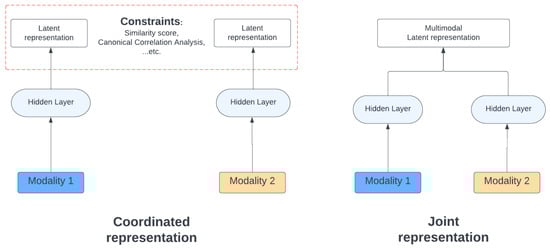 The purpose of representation learning is to capture complementary data and exploit these through a proper representation vector that summarizes the most valuable features [2,3,7]. The heterogeneity of multimodal data makes it challenging to construct such representations. For example, language is often symbolic while audio and visual modalities will be represented as signals. While issues with missing data or the absence of some modalities may arise, representations should be adapted to solve the issues as mentioned earlier. In the literature, it is often divided into two categories, joint and coordinated representation, as illustrated in Figure 2.