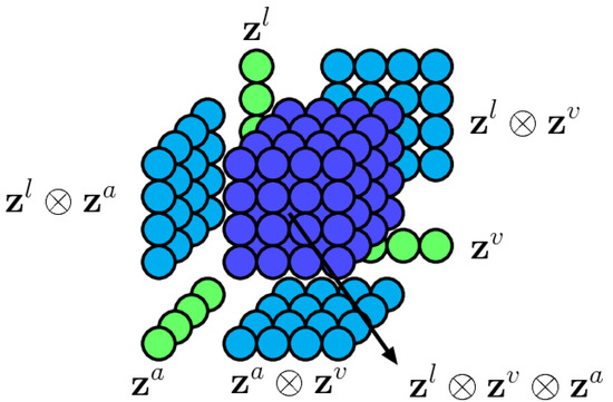 - Tensor fusion: The main idea behind this technique is to capture complex interactions and complementary information between modalities’ embeddings. To do so, in [19], they suggested performing a 3-fold Cartesian multiplication between all modalities (see Figure 4). The particularity of this technique is that it preserves the unimodal characteristics as well as the trimodal and bimodal ones. Despite the advantages of being non-parametric, it comes with a high computation cost, which increases the model complexity and might not be adapted for real-world applications.