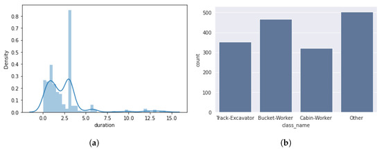 Dataset statistics of the simulated dataset, as provided in [1]: (a) Action’s duration (in seconds) distribution; and (b) class distribution of the simulated dangerous actions.
