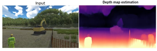 The railway construction dangerous action recordings were initially introduced in the work [1]. Readers are encouraged to refer to the Figure 8 and Table 2 for the class distribution statistics and a detailed definition of each dangerous action. This dataset consists of dangerous actions generated using the game engine Unity (https://unity.com/ (accessed on 7 May 2024)) which gives enough flexibility to generate a wide range of scenarios within these environments. The scenes consisted of scenes close to real-world scenarios where workers are confronted with dangerous situations. Given that this unimodal dataset was initially provided (RGB sequences only), this work has been extended by generating synthetic depth map sequences given RGB modality. Indeed, multiple works have been proposed for depth estimation [68] and monodepth2 [69] was selected for its superior results on the KITTI benchmark [70]. In Figure 9, an example using monodepth2 on a simulated video sample is demonstrated.