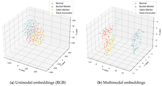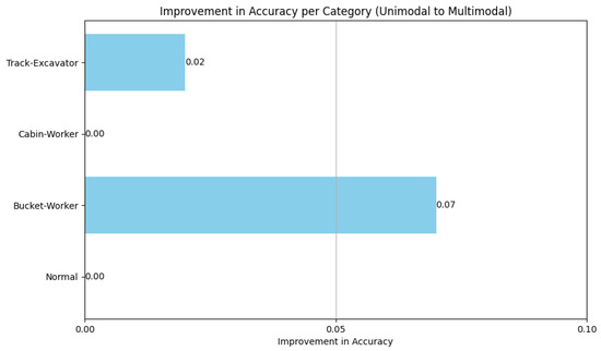 The results indicate that the addition of depth information alongside RGB sequence contributes to varying degrees of accuracy improvement across action classes. Specifically, the “Bucket-Worker” class showed the most significant improvement with a 7% increase in accuracy, followed by “Track-Excavator” with a 2% increase. The categories “Normal” and “Cabin-Worker”, however, showed no improvement. These results suggest that the depth maps modality contributes more significantly to categories where the additional depth information likely provides crucial distinguishing features not available in RGB data alone. Indeed, this information is crucial to perceive how far the worker is from the operating engines to determine whether there is a risk of collision.