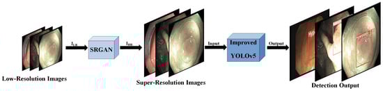 In this paper, we propose a model for intestinal polyp detection that combines a fused SR and an improved YOLOv5 algorithm. The pertinent structure is depicted in Figure 1. The process starts with the low-resolution image () being reconstructed into a super-resolution image () by using SRGAN. are obtained by applying a Gaussian filter to high-resolution images () and then downsampling. Subsequently, the reconstructed images are input into YOLOv5 to detect colon polyps.