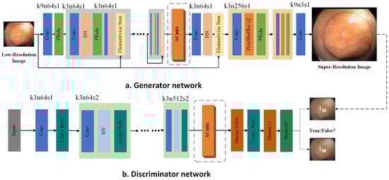 The discriminator network module consists of seven convolutional layers with the LeakyReLU activation function. To differentiate between and , two fully connected layers and a sigmoid activation function are added after the convolutional layer. The perceptual loss function of SRGAN [19] is shown in Equation (1). The perceptual loss is composed of two parts: content loss () and adversarial loss ().