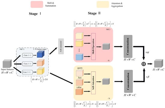 The ACmix module effectively combines the advantages of traditional convolution and the self-attention mechanism to improve the network’s focus on details. The structure of this module is illustrated in Figure 2.