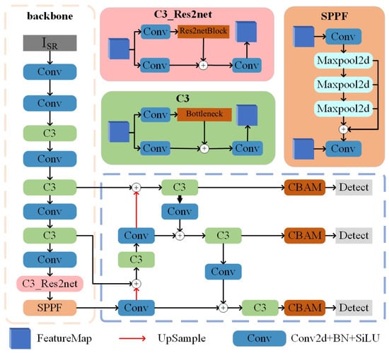 Aiming to enhance the efficiency of the conventional YOLO detection algorithm, this paper proposes improvements to YOLOv5, specifically, a C3 fusion feature extraction module based on Res2net [46] within the backbone network. Additionally, we incorporate an attention mechanism, CBAM [47], into the detection layer. As a result, an intestinal polyp detection framework based on YOLOv5s is proposed. The precise configuration is exhibited in Figure 4.