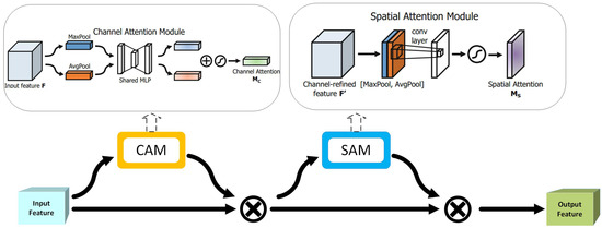 The CBAM attention mechanism initiates by directing input feature values to CAM, where weighted calculations occur. Subsequently, these processed values are directed to SAM, where weighted calculations are once again performed. The specific calculations are defined by Equations (6) and (7).