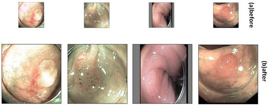 In the super-resolution reconstruction experiment, a total of 28,000 colonoscopy images were processed. This reconstruction technique improves the resolution quality of the captured images, resulting in enhanced accuracy for polyp identification. The achieved value of 30.14 and measure of 0.79 demonstrate significant improvement in the SR reconstruction, providing essential and more detailed information for future detection. Figure 7 presents images from enteroscopy, both before (a) and after (b) SR reconstruction. The clearer edges of the polyps after SR reconstruction contribute to improved subsequent polyp detection. Figure 8 shows the details of some intestinal polyp images before and after reconstruction. The reconstructed images contain more texture, structure, and other detailed information.