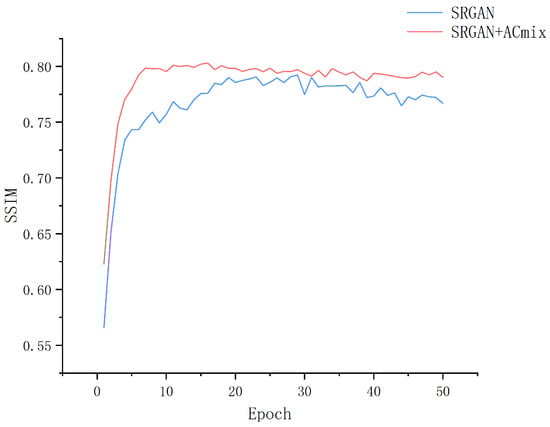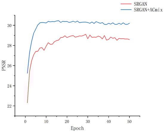 With the increase in experimental epochs, the curves of PNSR and SSIM are shown in Figure 9 and Figure 10. The table illustrates that the SRGAN that introduces the ACmix self-attention convolution module improves the SSIM by 0.02 compared with the original model. In comparison to the original SRGAN, the in this article increased by 1.64, thereby improving the visual effect of intestinal polyp data.