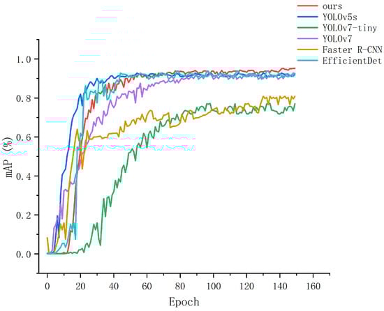 In comparison to other models [49,50,51], the model proposed in this study exhibits improved performance across three key indicators. The detection model presented here surpasses the YOLOv5s benchmark by enhancing mean average precision (mAP) by 1.8%, precision by 2.3%, and recall by 5.6%. When comparing YOLOv7-tiny and YOLOv7, we observe distinct improvements in precision, recall, and mAP. Specifically, precision increased by 16% and 3.1% for YOLOv7-tiny and YOLOv7, respectively. Additionally, recall exhibited significant enhancements of 23.4% and 6.4% for the two models, while mAP experienced notable improvements of 20.4% and 2.8%, respectively. Compared to the Faster R-CNN model, the enhanced model demonstrates a notable 19.6% improvement in precision, an 18.3% increase in recall, and a significant 15.1% enhancement in mAP. Utilizing EfficientDet resulted in achieving an mAP of 92.5%. These findings collectively demonstrate the enhanced efficiency of detecting colorectal polyps using the proposed model in this investigation.