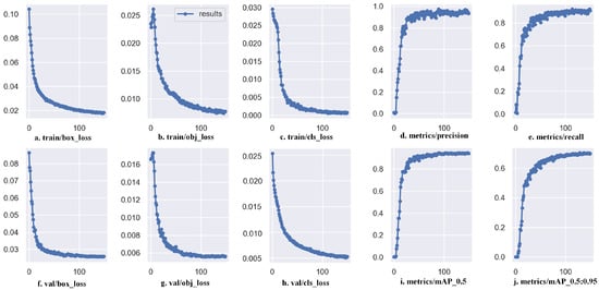 In YOLO detection, evaluation metrics such as , , (mean average precision), and F1-score are commonly employed. The specific formulas for these metrics [48] are provided in Equations (10)–(13).