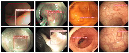 Figure 14 presents the results of polyp detection, depicting results for two distinct polyp types. The model demonstrates proficiency in detecting various polyp types.