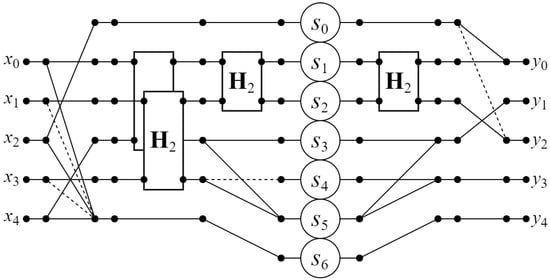 Figure 4 shows a data flow graph of the synthesized algorithm for five-point DST-II. As can be seen, we are able to reduce the number of multiplication operations from 23 to 7 and the number of addition operations from 18 to 17.