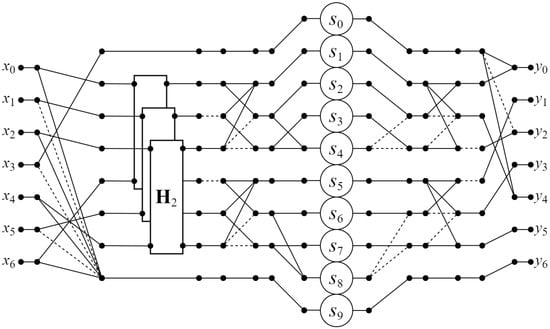 Figure 6 shows a data flow graph of the synthesized algorithm for seven-point DST-II. As can be seen, we are able to reduce the number of multiplication operations from 46 to 10 and the number of addition operations from 39 to 37.