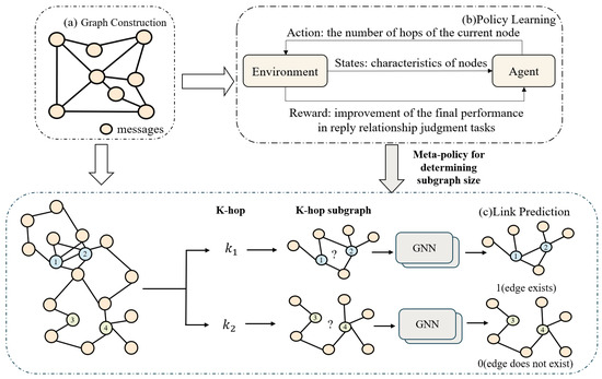 In this article, we propose a general learning framework called Policy-SEAL, which focuses on understanding interactive relationships depicted in graphs, specifically for determining reply relationships in multi-party conversations (MPCs). The core objective of Policy-SEAL is to automatically extract optimally sized subgraphs from the input data, enabling the efficient handling of complex link prediction tasks. This framework builds upon the SEAL model, enhancing its capabilities by integrating graph structure representation, policy learning, and intelligent subgraph resizing. This combination offers a more precise and resource-efficient solution. Notably, Policy-SEAL distinguishes itself from traditional approaches by its ability to adaptively learn subgraph sizes. Unlike conventional methods that rely on fixed subgraph sizes and may overlook dataset-specific variations, Policy-SEAL leverages reinforcement learning to determine the optimal subgraph size based on each dataset’s unique characteristics. This adaptive approach not only enhances accuracy but also leads to savings in computing resources and labor costs.