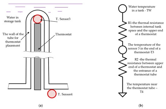 The placement of temperature sensors inside and near the tube of a thermostat (a) and the equivalent circuit of a temperature measurements. (a) The placement of the upper and lower temperature sensors inside and near the thermostat tube. Purpil lines simbolize a water in storage tank. (b) The equivalent termal circuit for the assessment of a tank hot water temperature.