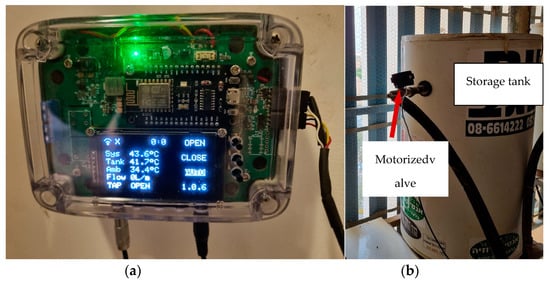 The experimental electronic system designed to validate the proposed control approach was developed and implemented within a designated residential unit. Tailored for individual household use, this control system comprises several components: a control unit (depicted in Figure 4a), a motorized valve integrated into the hot water pipeline (illustrated in Figure 4b) connecting to a heat exchanger, and multiple temperature sensors. Among these sensors, one is positioned along the hot water pipeline, while two reside within the storage tank. One sensor is situated within the thermostat housing, with the other placed nearby. An additional fourth temperature sensor is installed on the outlet pipe post-heat exchanger, whereas the fifth sensor is posed for the measurement of environmental temperature. The accuracy of the used sensors was ±0.5 °C.