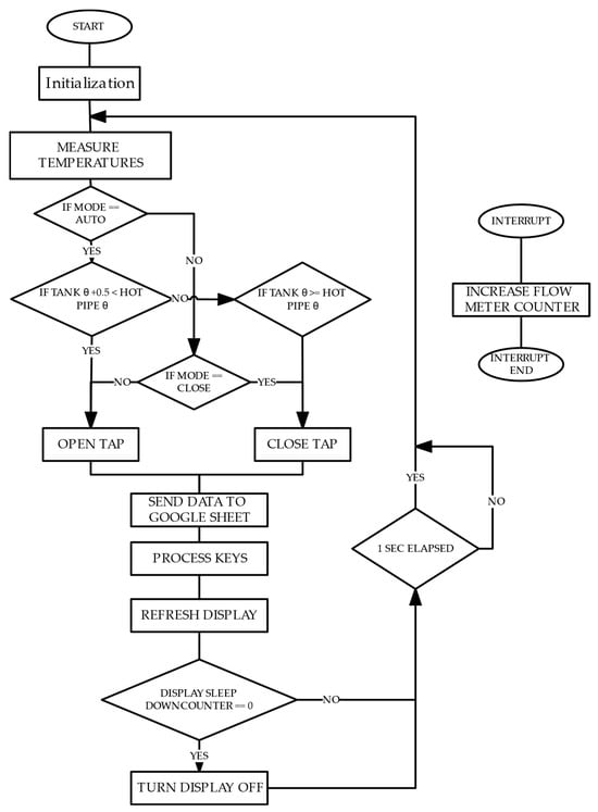 The electronic board of the control unit includes the most important components such as motorized controllable water valve CWX-15N [], five temperature sensors DS18B [], water flow sensor YF-S201 [], Node MCU module ESP8622 [], and current sensor SCT013-010 []. Important aspects of the control unit are further described below.