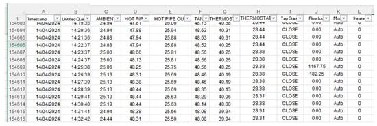 In the first column, the date of the measurements is displayed, while the second column indicates the exact time. The third to eighth columns present temperatures: ambient temperature outside the tank, temperature of the hot pipe, temperature in the output of the hot pipe after the heat exchanger, estimated temperature of hot water in the tank, and temperatures of the upper and lower sensors. The following column indicates the status of the valve (“CLOSE” or “OPEN”). The tenth column shows the minute usage of hot water (cm3), and the eleventh column indicates the mode of activation of the control unit (“Auto” or “Manual”). The final twelfth column represents the current of the electrical heater (mA).