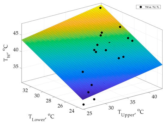 A specialized procedure is implemented, incorporating data from two sensors for temperature estimation. This procedure involves establishing a linear relationship between the actual temperature and the outputs of these sensors. The sensors are positioned as previously mentioned: one at the top of a thermostat inside the tank and the other near the orifice of the thermostat tube outside the tank. To assess the accuracy of this estimation method, samples of tank water were periodically collected and compared with the signals from the sensors. The findings of this analysis are depicted in Figure 8, where measured points are plotted alongside the 3-D linear approximation.