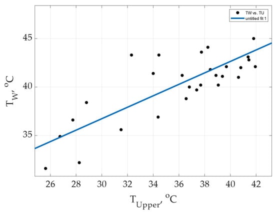 The coefficient of determination for the fitting closeness is R2 = 0.64, indicating a weaker correlation compared to the previous approximation. Furthermore, the standard deviation of real measurements, represented by the mathematical expression, is much higher at 2.2 °C, which is approximately 22% worse. In accordance with what was demonstrated above, Function (2) was considered for the hot water temperature estimation.