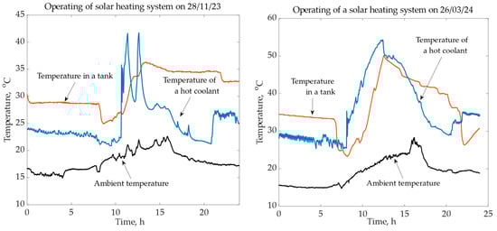 This section summarizes statistical data of the temperature change and usage of hot water as well as the surrounding measurements, which were obtained from the meteorological station located ~3 km from a building []. The data of a system operation were collected from a special Internet web page and is shown in Figure 7.