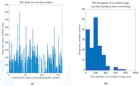 Data on the usage of hot coolant during days of system monitoring: (a) in consecutive days; (b) histogram of time valve “ON “distribution.