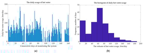 Data of daily usage of hot water; (a) graph in consecutive days; (b) histogram of water volume use.
