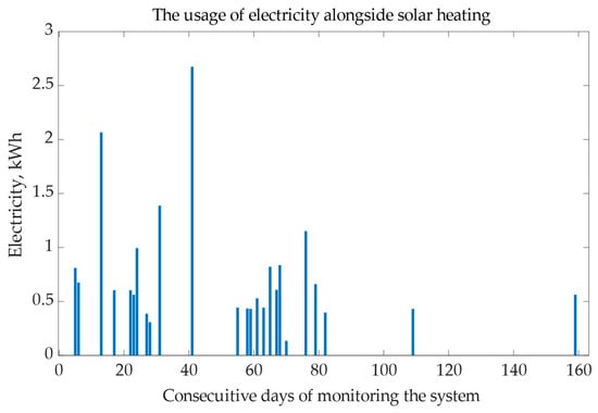 The graphs in Figure 13 represent the consumption of electricity for water heating alongside solar energy utilization, particularly during periods of insufficient solar irradiation.