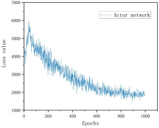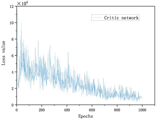 Firstly, the convergence of the algorithm designed in this paper is evaluated, and this paper evaluates the convergence through two objects. The LMADDPG algorithm proposed in this paper performs task offloading through actor–critic network, so the first object for evaluation is the loss function values of the two networks. DRL-Agent will probabilistically choose the action in each step and, thus, the image will fluctuate continuously. Where Figure 2 represents the actor–network loss value and Figure 3 represents the critic–network loss value. As can be seen from Figure 2 and Figure 3, with the increase in the number of iterations, the loss values of the two networks are decreasing and both of them begin to converge gradually, indicating that both networks are functioning properly.