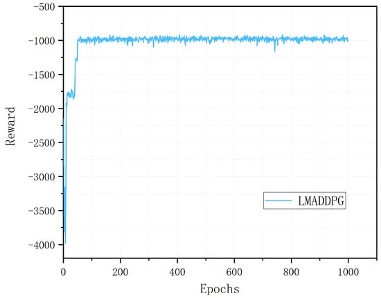 The LMADDPG algorithm reward value is used as the second evaluation object. In Figure 4, the convergence judgment of the LMADDPG algorithm is demonstrated. The algorithm, which undergoes a learning process, has a strong tendency to jitter in the initial phase due to the randomness of early reinforcement learning. However, the reward value obviously grows as the number of iterations increases. Through the learning process, an optimal task-offloading decision is finally learned, which leads to the stabilization of the reward value, i.e., the LMADDPG algorithm gradually reaches convergence. Moreover, the algorithm of this paper can reach convergence in a very short number of iterations, which can be attributed to its policy update. This update integrates the deterministic behavioral policy with the exploitation of the Q-value function. The effectiveness of the LMADDPG algorithm is based on the proof of convergence of the two evaluated objects described above.
