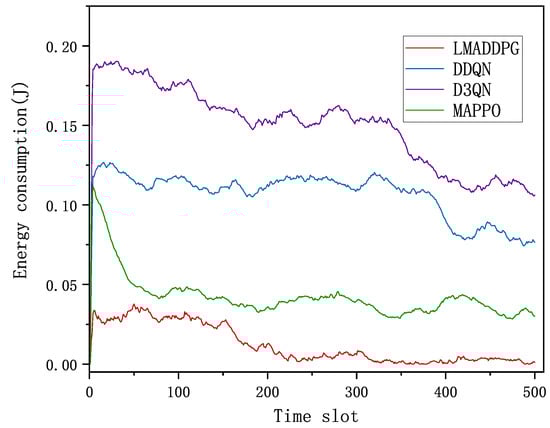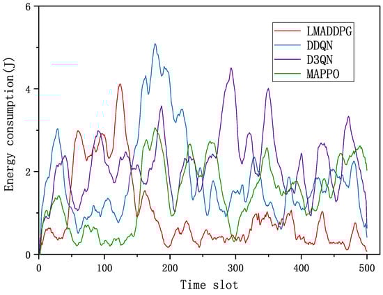 In Figure 6, the energy consumption of four different algorithms MEC energy queues are evaluated. It can be seen that the MEC energy queues of the optimized algorithms do not have an infinite rising trend. As the time slot progresses, it becomes evident that the MEC energy queue of the LMADDPG algorithm exhibits a more stable behavior compared to the other algorithms. Although the performance of LMADDPG will be lower than other algorithms in the initial process of task offloading, the performance of LMADDPG is more advantageous in the long-term process. The LMADDPG algorithm outperforms the other baseline algorithms more in keeping the MEC energy stable during long-term optimization.