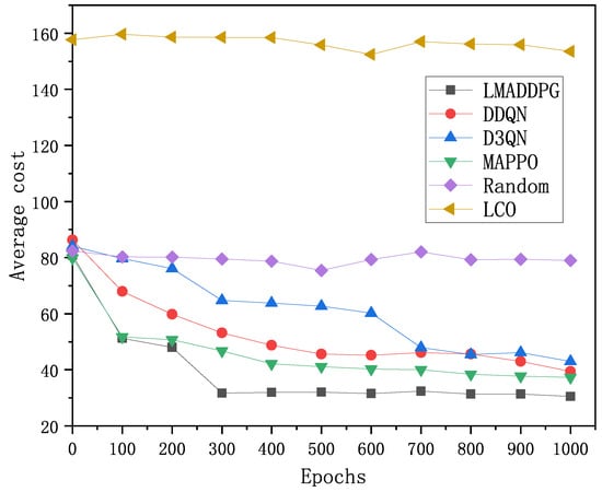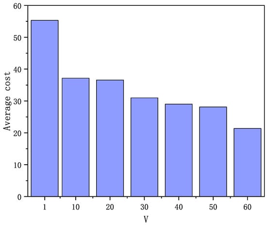 In addition, the effect of penalty coefficient adjustment average task-offloading cost is experimentally compared. The impact of Lyapunov penalty coefficient V on the performance of LMADDPG is further demonstrated in Figure 7, where the delay and energy weighted sum of tasks will be compared by adjusting the penalty coefficient V, setting . As V increases, the average cost is decreasing, which is due to the skewing of the fairness of the optimization strategy when the penalty factor is increasing. This trend is due to the fact that the higher the value of V gives more weight to the weighted delay and energy cost, which drives the algorithm towards cost optimization. Therefore, in practical scenarios, a suitable V value needs to be set to balance the average system energy consumption as well as the stability between the average MEC energy and the average cost.