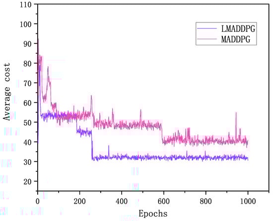Figure 8 shows the performance comparison between the LMADDPG algorithm and the MADDPG algorithm using multi-queue optimization. Both algorithms perform task-offloading decisions separately and calculate the average task-offloading cost, i.e., the average cost. The proposed LMADDPG algorithm is able to reach stability in a very short number of iterations, converges better than the MADDPG algorithm, and produces a much smaller average cost than the MADDPG algorithm. This shows that the LMADDPG outperforms MADDPG in terms of performance.