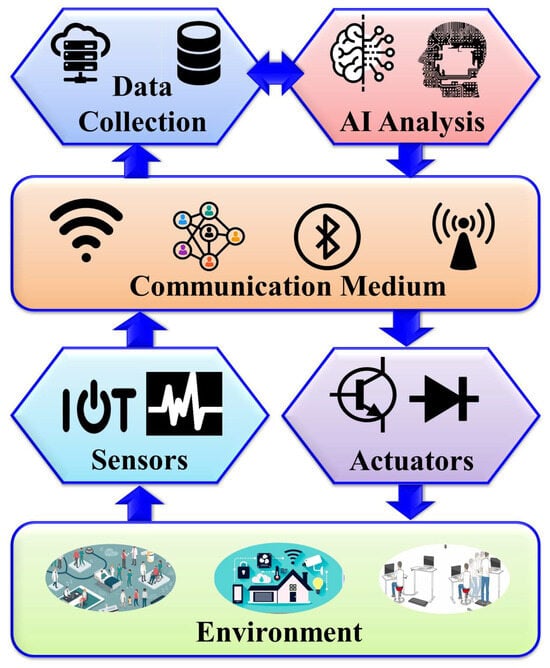 Within the realm of AMI, the creation of intelligent environments relies on synergy between various components working harmoniously to enhance user experiences and streamline everyday tasks. Figure 1 depicts the core components of AMI systems in healthcare, including the environment, intelligent sensing technologies, actuators, communication media, and advanced AI algorithms. These components form the foundation of AMI environments, enabling them to perceive, process, and respond to user interactions seamlessly and intuitively.