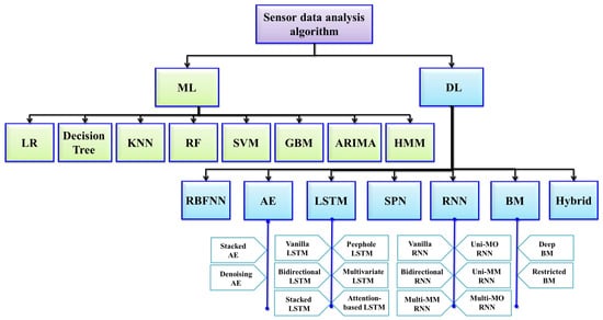 Furthermore, DL approaches are often applied to enhance accuracy. For instance, one-dimensional (1D) DL models such as GlucoNet are used for accurate blood glucose level measurement [25], while intraocular pressure sensors benefit from automated feature extraction using 1D CNNs [43]. DL-based algorithms, including deep neural networks (DNNs), graph neural networks (GNNs), deep belief networks (DBNs), generative adversarial networks (GANs), transformers, recurrent neural networks (RNNs), autoencoders, attention mechanisms, and CapsNets, as well as reinforcement learning (RL), are options for further improving accuracy [35,44]. Additionally, the accuracy of CBGM can be enhanced using the multilayer perceptron (MLP) approach. In this approach, data are categorized into classes such as hypoglycemia, non-diabetic, prediabetes, diabetes, severe diabetes, and critical diabetes. A patient-specific personalized model is then trained, with MLP used in the final stage for accurate prediction of blood glucose concentration [45]. Moreover, DL-based hybrid approaches have been applied for improving the accuracy of EMG by combining CNN and long short-term memory (LSTM) models [46]. Multiple DL models can be combined in an ensembling approach to increase the predictive accuracy of ECG-based sensor data [47].