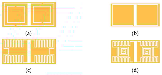 Figure 1 illustrates the prototypes of four different types of CSRRs, in which the golden area represents metallization and the white area represents a void. By etching the conventional CSRR in Figure 1a on an SIW, a passband below the waveguide cutoff frequency is obtained. The simplified CSRR in Figure 1b has a similar resonant circuit as that of the conventional CSRR, but the resonant frequency is slightly increased due to the reduction in equivalent capacitance and inductance. To enhance the compactness of the simplified CSRR, the CSRR ring is folded, as shown in Figure 1c, resulting in an increase in the equivalent inductance. Figure 1d extends Figure 1c by incorporating a complementary spiral resonator (CSR) within the folded ring. This modification leads to an additional passband below the cutoff frequency. These four CSRR prototypes are arranged in parallel in opposite directions, and a slot is etched in the middle of the symmetrically mirrored units. This arrangement inhibits the TE10 mode of the waveguide and increases the coupling of the two CSRRs, resulting in improved stopband rejection and wider passbands.