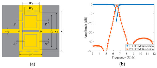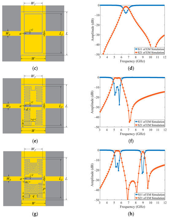 (a) Circuit prototype and (b) EM simulation of the bandpass filter based on the conventional CSRR in Figure 1a; (c) Circuit prototype and (d) EM simulation of the bandpass filter based on the simplified CSRR in Figure 1b; (e) Circuit prototype and (f) EM simulation of the bandpass filter based on the simplified CSRR with a folded ring in Figure 1c; (g) Circuit prototype and (h) EM simulation of the proposed CSRR-based dual-band filter based on the modified CSRR in Figure 1d.