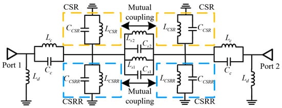 Accordingly, the simplified equivalent circuit is derived in Figure 3 to provide a better understanding of the dual-bandpass behavior of the filter. The simplified equivalent circuit can be divided into five parts: two resonant circuits of CSRRs, two resonant circuits of CSRs, the mutual coupling of the two CSRRs and the two CSRs, the mutual coupling between the modified CSRRs and the waveguide transmission line, and the high-pass transmission characteristic contributed by the metallic vias of the SIW. For the four shunt-connected resonant units enclosed by yellow and blue boxes, the equivalent circuits of CSRRs and CSRs are all modeled with a parallel resonant consisting of a capacitor and an inductor. The capacitances of the CSRR and CSR are denoted by CCSRR and CCSR, respectively. The inductances of the CSRR and CSR are denoted by LCSRR and LCSR, respectively. Regarding the dominant mutual coupling, two coupling elements are considered in the equivalent circuit. The inductive and capacitive coupling between the CSRRs is described using a series unit consisting of an inductance and a capacitance, denoted by Ls1 and Cs1, respectively. Similarly, the inductive and capacitive coupling between the CSRs is described using a series unit with the elements denoted by Ls2 and Cs2. The mutual coupling between the modified CSRR and the waveguide transmission line is represented by a series unit denoted by Lc and Cc, respectively. The via walls are just represented by the inductance Ld at both feed ports. Three transmission zeros are produced by the three series units, which are contributed by the three mutual couplings. And the center frequencies f1 and f2 of the two passbands are located at the two resonance frequencies fCSRR and fCSR of the CSRR and CSR; they can be expressed as illustrated in [11]: