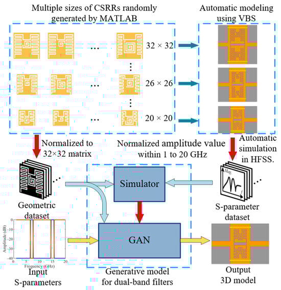 The proposed circuit prototype shown in Figure 1d consists of a folded outer ring and a spiral inner ring, which can be challenging to build using the traditional modeling method with multiple variable dimensions. To address this issue, a GAN-based generative model, known for its proficiency in pattern processing and generation, was developed based on the prototype of the proposed CSRRs. This generative model helps solve the quick design problems of dual-band filters across a wide frequency range. The circuit prototype of the CSRRs is represented using straight lines and square shapes, allowing it to be expressed as Boolean matrices, in which the value of 1 in the matrices denotes metallization and 0 denotes a void. Here, a 32 × 32 matrix with a cell pixel size of 0.1 mm × 0.1 mm is used to represent the circuit prototype. By applying a series of deep learning networks to the patterns and corresponding electrical parameters, the generative model can be constructed for inverse designs of the dual-band filters. Through the extensive training of the networks, an efficient generative model for the filters within the frequency range of 1 to 20 GHz is constructed. Figure 4 illustrates the building process of the generative model, which can be divided into two main parts: the preparation of the training dataset and the construction of the multiple interconnected CNNs. Additionally, four inverse design processes are presented to demonstrate the effectiveness of this method.