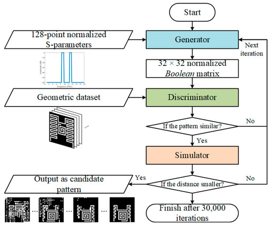 The generative adversarial network, which is constructed with two CNNs named the generator and discriminator, is utilized to implement the function of inversely designing filters with specific S-parameter requirements. The inverse design iterative process of the generative model is illustrated in Figure 5. First, the normalized S-parameters, consisting of 128 points, are input into a well-constructed generator. The generator outputs a 32 × 32 Boolean matrix that represents the circuit prototype. Then, this output matrix is recognized by a well-constructed discriminator to determine if it exhibits similar features to the patterns in the geometric dataset. Once identified as similar, the S-parameters of the circuit prototype corresponding to this matrix are predicted by the pre-trained simulator and compared with the input S-parameters by calculating the Euclidean distances between the two S-parameter vectors. During the iterative process of inverse design, the independently created CNNs, the generator and the discriminator, continuously optimize their internal weights, resulting in the refinement of the generative model and the generation of increasingly accurate candidate matrices.