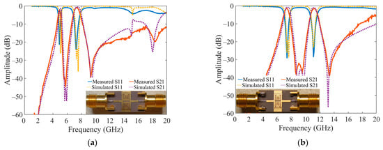 It can be observed in Figure 7 that the center frequencies of the dual-band filters have a slight deviation compared to the desired center frequencies. This mainly resulted due to two factors. Firstly, the generative model used for the inverse design of circuit patterns has inherent errors due to the limited dimensionality of the input S-parameters during prediction and inverse design processes. Secondly, the manufacturing process of the circuit boards introduces extra errors that can also contribute to frequency deviations. It can be seen in Figure 7a that the simulation and measurement results of the dual-band filter show a noticeable deviation at high frequencies. There are two possible reasons for this discrepancy. Firstly, the simulation model did not consider the impact of the added microstrip line and SMA connector on the external coupling parameters of the CSRR structure. Secondly, slight manufacturing errors in the PCB may have resulted in deviations in the center frequencies of the passbands, the coupling strength between the CSRR and CSR, and the coupling parameters of the modified CSRR to the microstrip line. These factors can potentially lead to significant deviations in the sensitive high-order transmission poles and zeros.