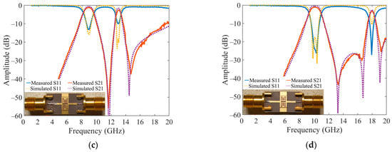 To further demonstrate the feasibility of the proposed generative model for the CSRR-based dual-band filters, the inversely designed filters in Figure 6 are fabricated and measured using the Taconic TLY-5 substrate with a thickness of 10 mil, the relative permittivity (εr) is 2.2, and the dielectric loss tangent (tan δ) is 0.0009. Photographs of the fabricated dual-band filters, as well as their simulated and measured results are depicted in Figure 7. Based on the measured results, it can be observed that the center frequencies of the four dual-band filters exhibit a maximum deviation of 0.22 GHz compared to the preset ideal frequencies, covering the range from 4.92 GHz to 18.02 GHz. The corresponding 3 dB fractional bandwidth (FBW) for these center frequencies ranges from 4.1% to 15.7%. The measured minimum in-band insertion losses are less than 3.3 dB, and the measured passband return losses are above 10 dB. A maximum attenuation between the passbands is detected, ranging from 39 dB to 55 dB. The circuit prototypes have design areas ranging from approximately 0.017 to 0.039 . The key technical properties are listed in Table 3 and compared with those of recently reported dual-band SIW filters in state-of-the-arts. The bandwidth performance of the designed filter is related to the input ideal S-parameters. By appropriately adjusting the passband bandwidths of the ideal S-parameters, the bandwidth of the designed filter can be expanded or reduced to a certain extent. In terms of the insertion loss performance, this is primarily attributed to radiation loss resulting from the partially closed structure. Additionally, there is a deviation in the insertion loss caused by the additional section of the microstrip line and the SMA connectors.