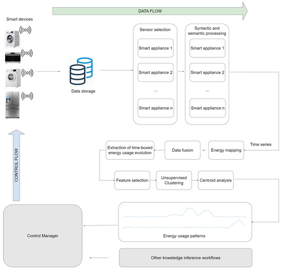 In Figure 1, we present the proposed pipeline for extracting daily electricity usage patterns from data generated by various smart home appliances integrated into a smart home architecture. The input for the data mining system is generated by various smart devices equipped with sensors capable of capturing different characteristics of the environment where the smart devices are deployed, as well as the interactions of the user with these smart devices. It is important to emphasize that the sensing information is given by sensors that are already deployed on the smart devices, not by external sensors. The devices shown in the figure do not represent the exact devices that are used for the experiments in this work. The devices currently present in the diagram are a symbolic representation of household smart devices equipped with sensors capable of measuring the interactions of the user with the devices. The sensor measurements are transmitted to cloud data storage. Using Big Data technologies, the relevant measurements are extracted for each. The extracted measurements differ based on the appliance type because each appliance can give insights about its usage and the corresponding energy usage with different measurements. For example, from a smart washing machine, we can extract the active running time to compute the energy because this type of smart device consumes energy while executing washing cycles, and it does not consume energy while idle. Other smart devices, such as refrigerators, can consume a rather constant amount of energy.