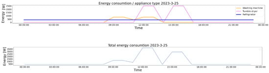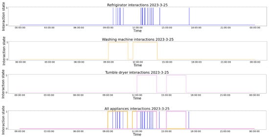 A visual representation of the time-series modeling of the usages of the three smart devices is presented in Figure 2. In the figure, we observe the usage of the refrigerator, the washing machine, and the tumble dryer in one day. The last section of the figure contains all of the usages in the same time period. The usage of the smart devices is taken from dataset DS1. We chose this day for exemplification because the interaction of the user with all of the smart devices is present.