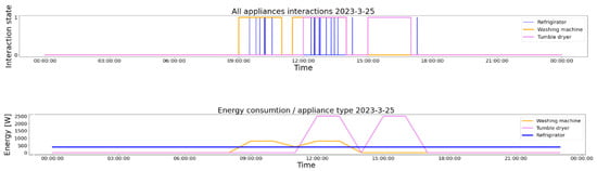 In Figure 3, we present the above transformation of the appliance usage signal into appliance energy consumption. The usage represented by the interactions with the smart devices is shown, and the obtained energy consumption for each device in the same time period is presented below.